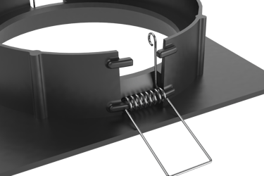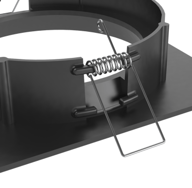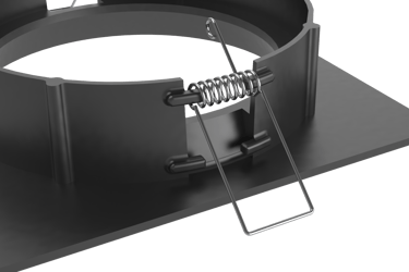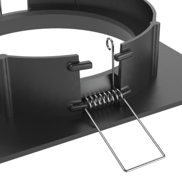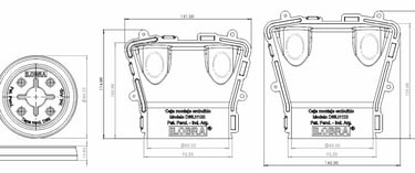 Incluye orificios en sus bordes para fijaciones temporales que mantienen la posición hasta el fraguado. Su base incorpora una abertura central y ranuras radiales que permiten alinear varias cajas de forma rápida y precisa.